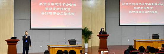 及相关部门教职工,为学会、协会逐渐壮大作出贡献的会员代表,给予学会、协会发展大力支持的各兄弟学会以及本次会议的报告人和主持人表示了衷心的感谢,并对北京应用统计学会和北京大数据协会今后的发展表达了美好的愿景。崔恒建教授回顾了“两会”成立的渊源和近年来的发展历程并作北京应用统计学会理事会工作报告,从会议举办情况、人才培养情况、培训开展情况和财务情况几个方面梳理了北京应用统计学会2023年的主要工作。随后,北京大数据协会常务副秘书长胡迪老师作北京大数据协会理事会工作报告,以工作简报形式总结协会及下属各专委会竞赛举办和工作开展和组织完善情况。