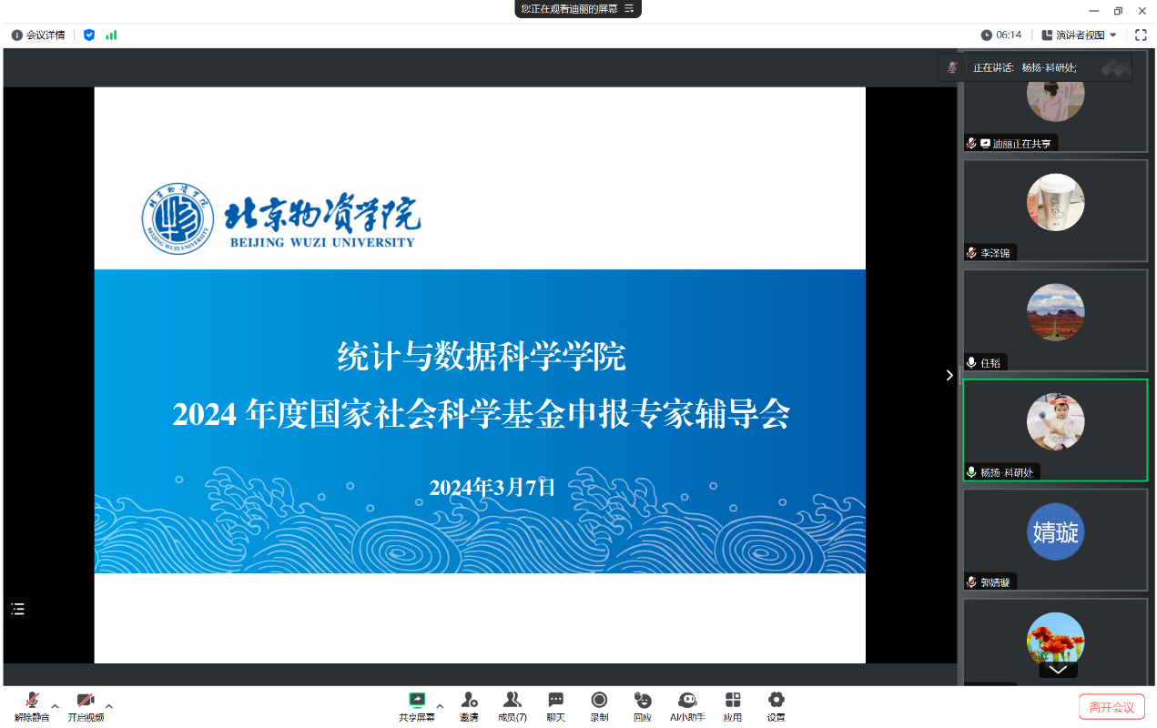 于线上举办了2024年度国家社会科学基金申报专家辅导会。本次辅导会邀请了首都经济贸易大学统计学院任韬教授作为辅导专家,与申请者进行一对一的交流和指导。学院申报2024年度国家社会科学基金的青年教师参加了此次辅导会,会议由科研处处长助理杨扬老师主持。