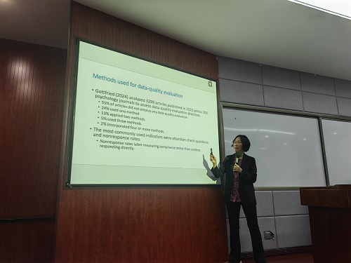 讲座中,王教授系统介绍了粗心应答的常用检测方法,包括注意力检查、作答反应时间控制、自评参与度评估、反应一致性检验和多变量离群值分析等。粗心应答对纵向密集研究中的数据质量构成威胁,然而很少有研究在纵向密集背景下探讨粗心应答的问题。王教授团队开展的日记追踪研究,通过每日的注意力检查和反应时间数据对粗心应答进行评估,并进行了包括依从性分析、普遍性分析、个人层面相关性分析和敏感性分析在内的系统研究。研究结果表明在纵向密集研究中纳入注意力检查和反应时间测量的重要性,并就如何处理粗心应答问题提出了具体建议,包括使用敏感性分析来评估粗心应答对纵向密集数据统计结论的影响。