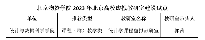 近日,北京市教育委员会公布了北京高校虚拟教研室建设试点名单,经各高校推荐、专家综合评议,共计101个虚拟教研室获批建设试点。我校郭茜教授牵头的“统计学课程虚拟教研室”成功入选,教研室类型为课程(群)教学类。