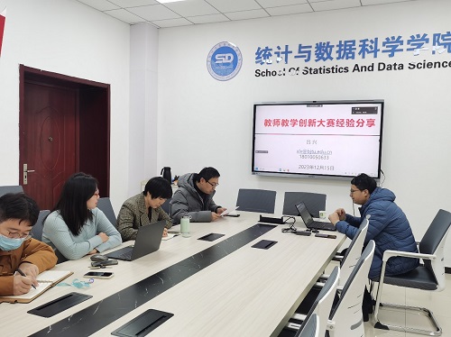 吕兴教授就大赛的基本情况、申请书填报、创新成果报告要点、PPT设计、教学大纲提炼、教案撰写、现场答辩等方面给教师们做了详细指导。吕兴教授以大赛通知的解读为切入点,对申报书撰写等要点进行了详细分析。在PPT设计、教案与教学大纲的撰写中,他提醒老师们要注重教学目标、教学内容、教学策略以及教学评价等基本要素,突出学科专业特色,既有师生互动又有生生互动的设计,同时将思政元素有机融合进教学内容。吕兴教授强调,大赛的申报书、创新报告、教学大纲、教学设计、课程讲授之间一定要层层递进、环环相扣,突出教学创新。随后,吕兴教授又向教师们展示了大赛的现场答辩环节。经验分享结束后,吕兴教授与教师们对参赛要点进行了讨论,并为备赛的教师答疑解惑,现场气氛轻松热烈。