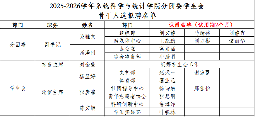 经公开报名、资格审查、面试考察、 商议讨论等环节,秉持“公平、公正、公开、择优”的选拔原则,现将2025-2026学年分团委、学生会干部拟任名单公示如下(通过试用期考核后,方可正式任职):
