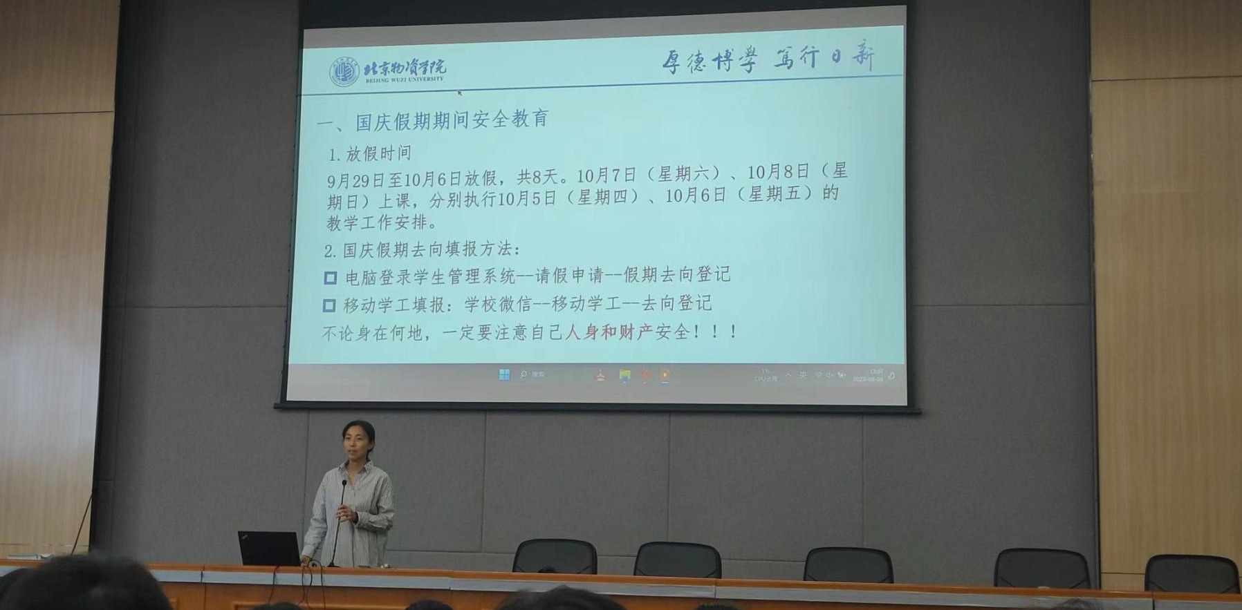 最后,针对大学生国庆安全以及在校期间日常安全问题,两位老师结合《学生手册》相关管理规定进行教育。明确了国庆放假时间,以及国庆假期去向填报方法,同时出于对同学们的安全关心,嘱咐同学们不论身在何处,一定要注意自身人身和财产安全。最后提出宿舍日常管理要求,对宿舍中的不良行为进行矫正,力求为同学们营造良好的住宿环境。