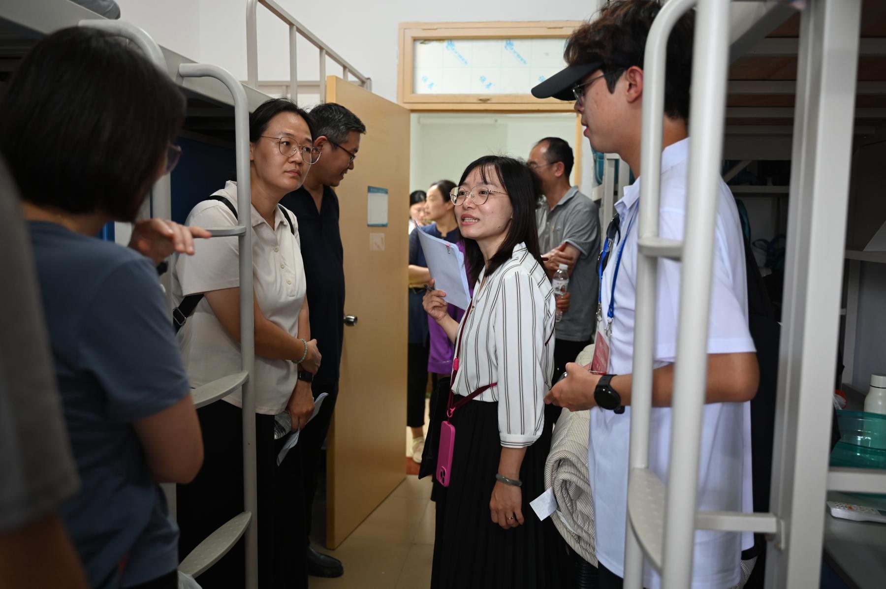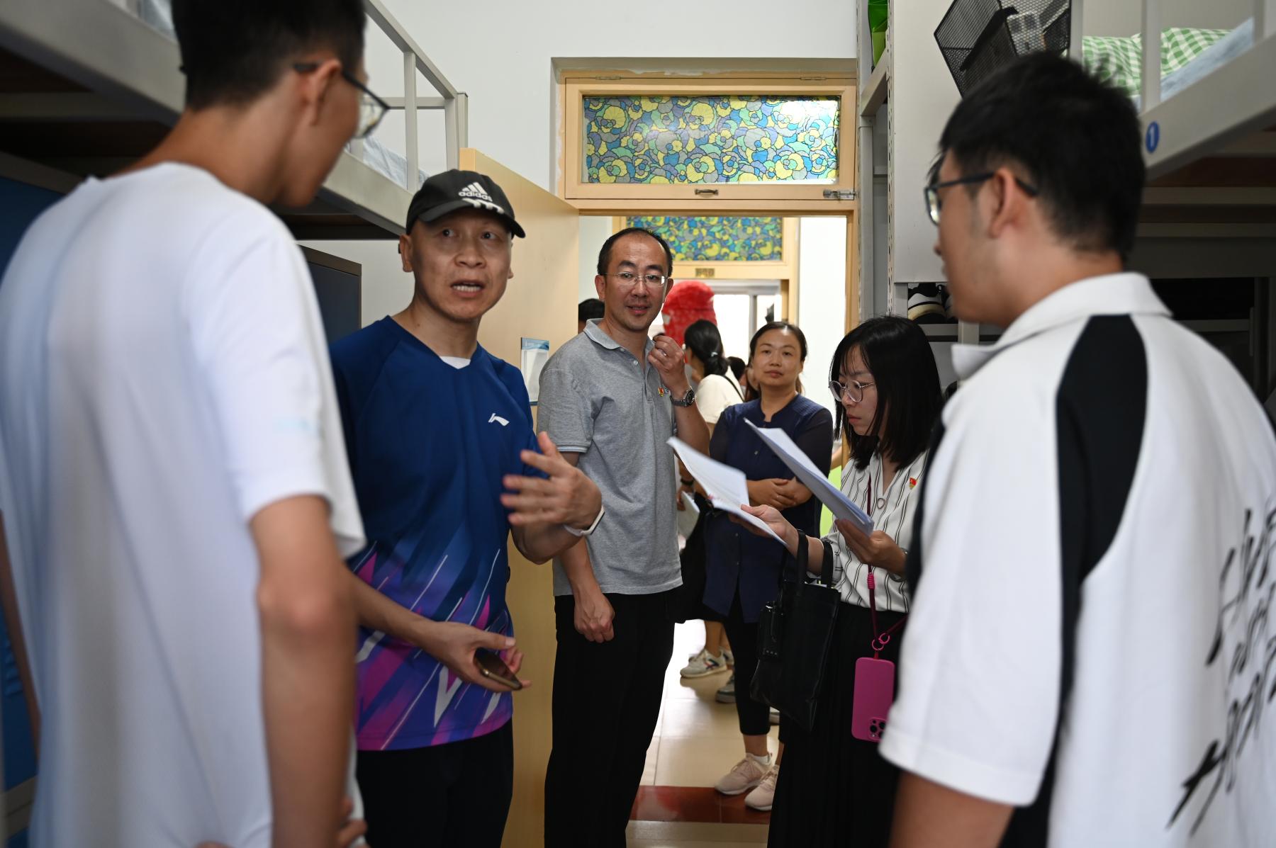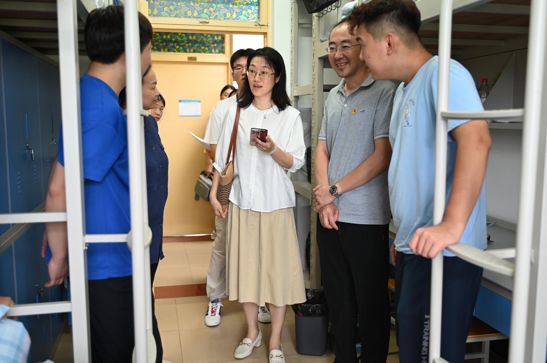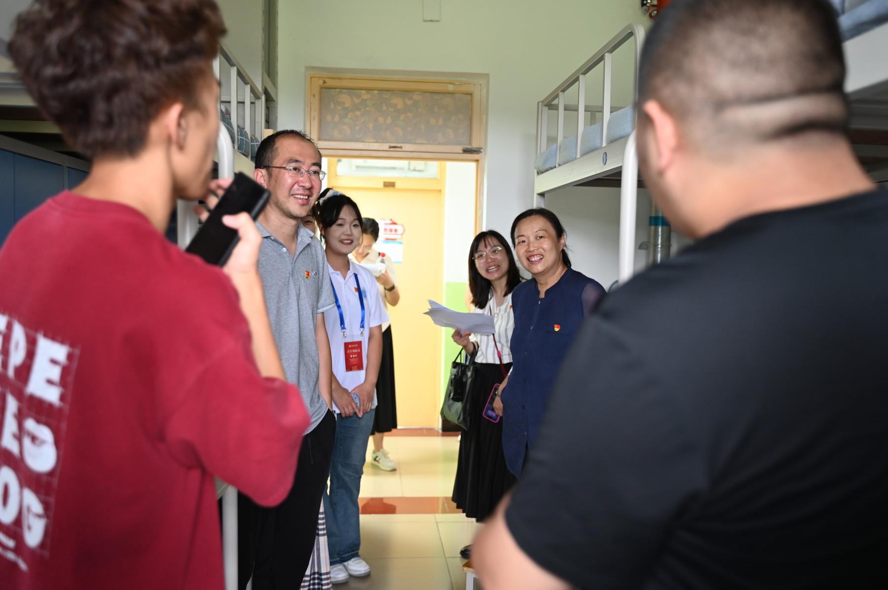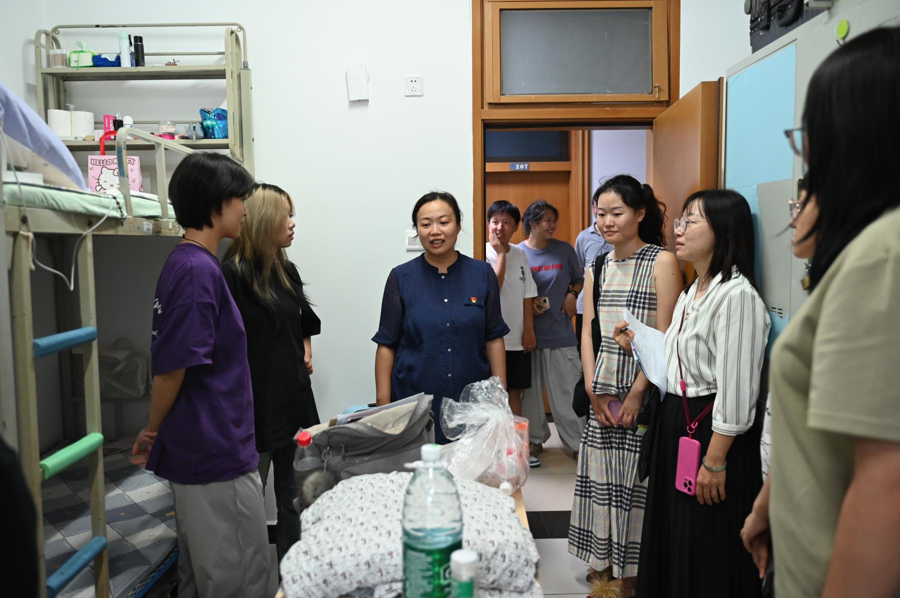 党总支书记续杨,院长郭茜,党总支副书记甄姿,新生班主任刘洪伟、郭婧璇、鞠红梅、吴玉文,辅导员徐文彬及新生班主任助理们一同走访了2024级本科生和研究生宿舍,为24级小浪花们带来学院的亲切关怀。