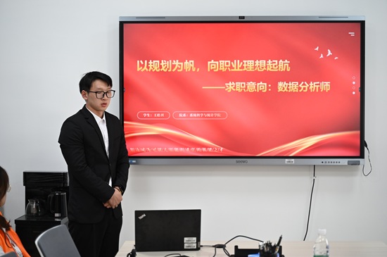 比赛现场气氛热烈,选手们按抽签顺序依次上台,结合精心制作的PPT,进行精彩的主题陈述。在就业赛道,选手们清晰阐述个人求职意向和职业准备情况,深入分析目标职业的发展前景与自身优势的契合点。