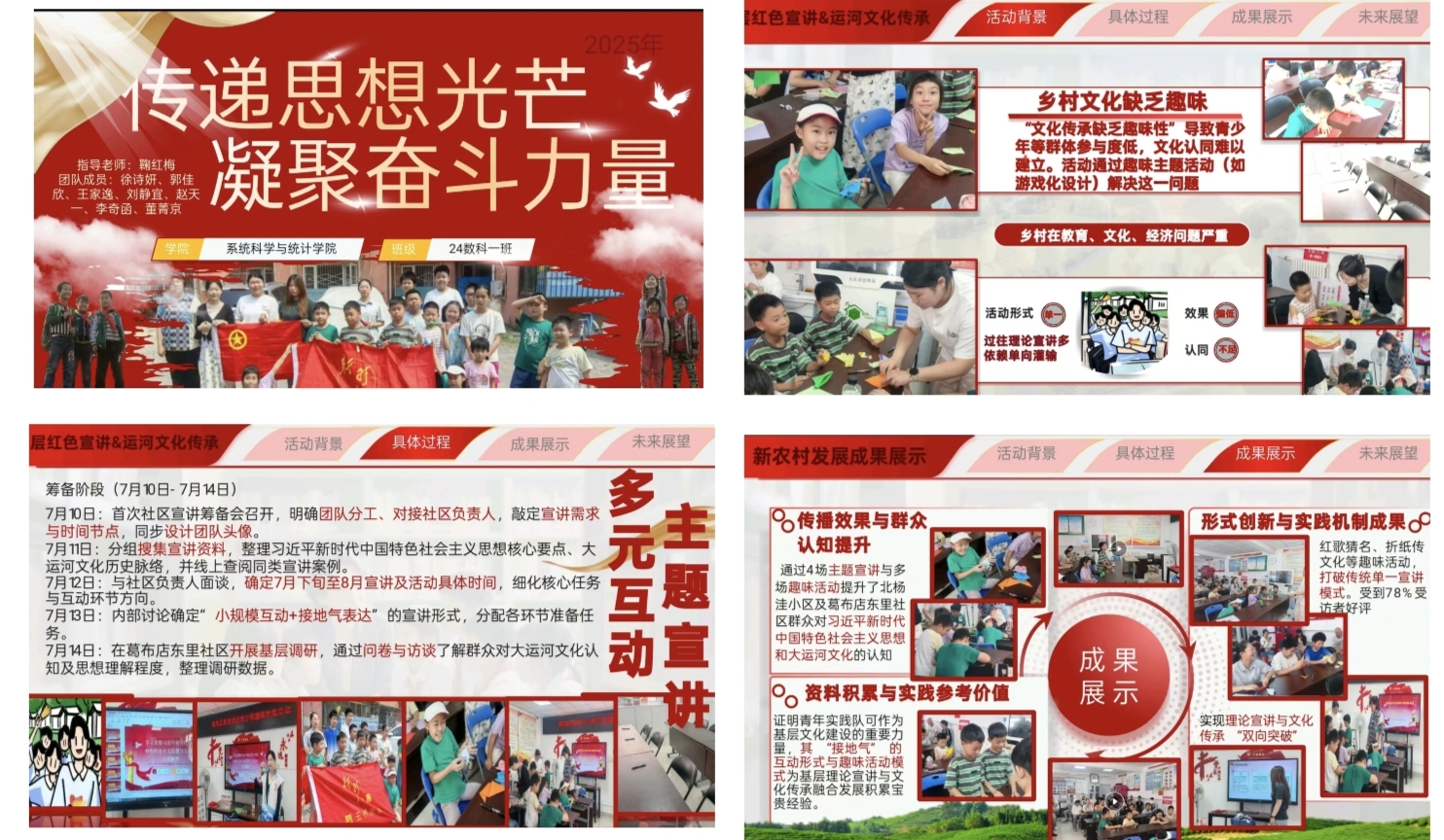 这个夏天,我院团队循着运河文脉、扎根乡村一线、聚焦基层需求,在实践中践行使命:有的深入挖掘运河历史底蕴,让文化传承有温度;有的运用专业知识助力乡村发展,让服务落地有实效;有的聚焦基层治理痛点,让青春担当有力量。从调研走访到成果落地,每一步都凝聚着队员们的汗水与思考,也让大家在“知行合一”中实现了自我成长。